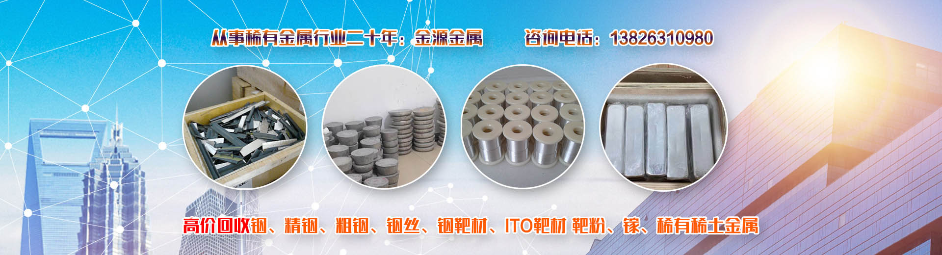 韶關(guān)市金源金屬材料有限公司坐落于中國廣東省韶關(guān)市,長期收購回收銦、精銦、粗銦、銦絲、銦靶材、ITO靶材靶粉、回收金屬鍺、鍺錠、鍺粉、鍺片、回收鍺單晶、單晶鍺、鍺粒、區(qū)熔鍺、工業(yè)鍺、廢鍺、鍺泥、鍺渣、二氧化鍺回收、四氯化鍺、有機(jī)鍺、銀、純銀、銀靶材、高價收購回收ITO廢靶、回收廢銦、廢銦沙、廢銦渣、回收粗銦、廢銦絲、廢銦珠、廢銦箔、廢銦棒、收購銀焊條、銀焊絲、導(dǎo)電銀膠、金屬鎵、硝酸鎵、氧化鎵、三氯化鎵、氯化鎵,供應(yīng)及回收氧化鎵、氫氧化鎵、碲化鎵,硒化鎵,銦粉,氧化銦、氯化銦、硫酸銦、硫化銦、醋酸銦、氫氧化銦、硒化銦,碘化銦,銅銦鎵硒,含金、銀、銦、銠、鈀、鎵、鍺等稀有貴金屬材料,稀土金屬材料、氧化鏑、氧化镥、氧化鋱、氧化鐠釹等回收。